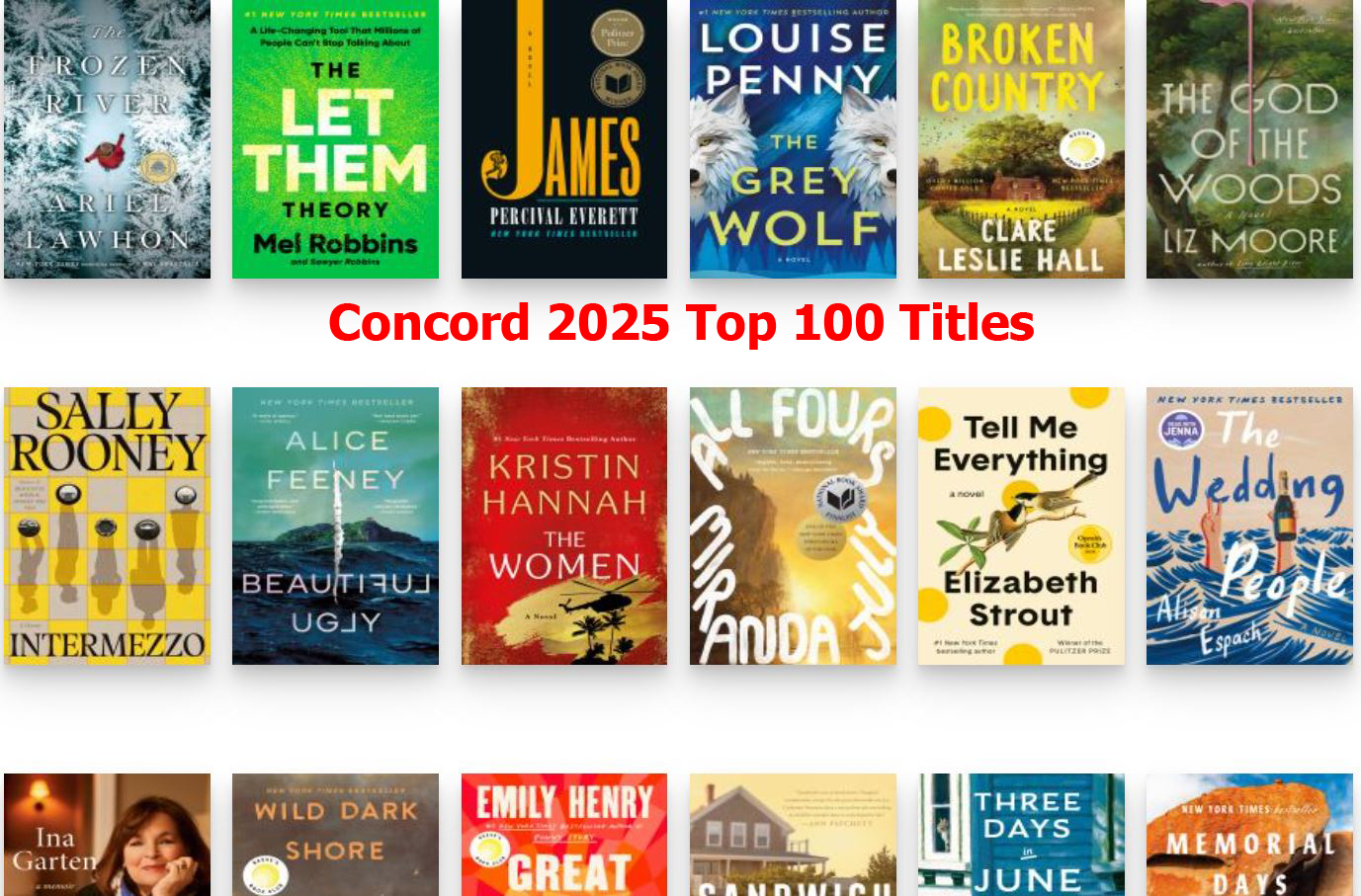 Each year the Concord Free Public Library adds about 10,000 new items to its collections in a variety of formats for all age groups. This Concord's Top 100 Titles list shows the top 100 adult books checked out by Concord patrons in 2025.