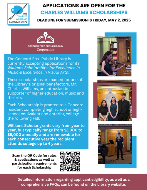 The Williams Scholarship Committee, an initiative of the Concord Free Public Library Corporation, is still accepting scholarship applications from college-bound high school seniors residing in Concord, Massachusetts for The Charles Williams Scholarship for Excellence in Music and The Charles Williams Scholarship for Excellence in the Visual Arts. **NOTE: Deadline has been extended. The new deadline is Friday, May 9, 2025**